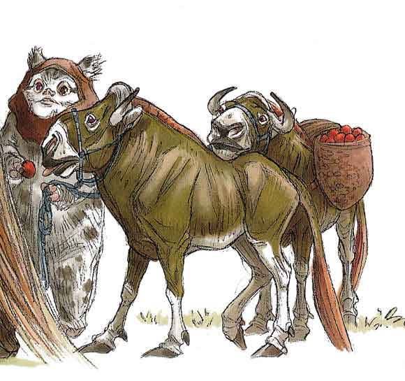 The bordok is a herbivorous equine animal, native to the forest moon of Endor. They have an erect mane, and short knobby forward pointing horns on either side of their head. It is used by Ewoks as a pack animal and a mount if captured.They can be really useful.I should pet one when they are in stock.